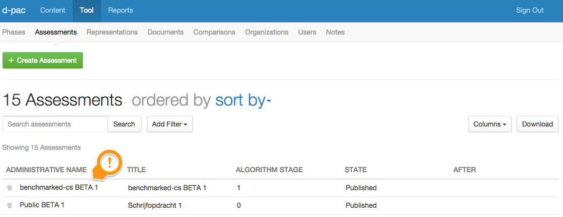State: By default an Assessment is in a "draft" state. This means that assessors will not be able to select this assessment for comparisons. It is useful to allow the PAM to create an assessment up-front and fill in the details over a period of time, without showing up in the assessment selection screen of the tool. Select "published" once you're done with an assessment and want to enable it in the tool: